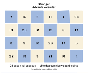 Omdat jij t/m 24 december elke dag een leuke aanbieding verdient heeft Stronger een adventskalender online gezet. Elke aanbieding is slechts 24 uur geldig. Benieuwd wat er vandaag in de aanbieding is? Ga naar Stronger en open het deurtje van vandaag.